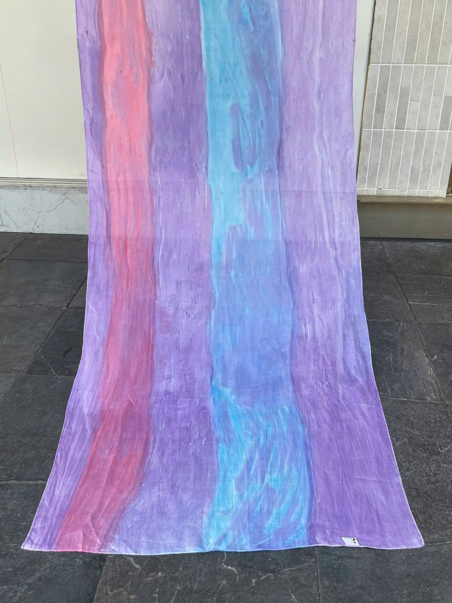 ·  Kỹ thuật: Kết hợp nhiều phương pháp thủ công: Ice Dye (tan chảy băng đá), Shibory (nhuộm buộc), và vẽ thủ công từng vệt màu trên khung vải.