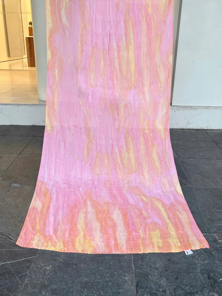 ·  Kỹ thuật: Kết hợp nhiều phương pháp thủ công: Ice Dye (tan chảy băng đá), Shibory (nhuộm buộc), và vẽ thủ công từng vệt màu trên khung vải.