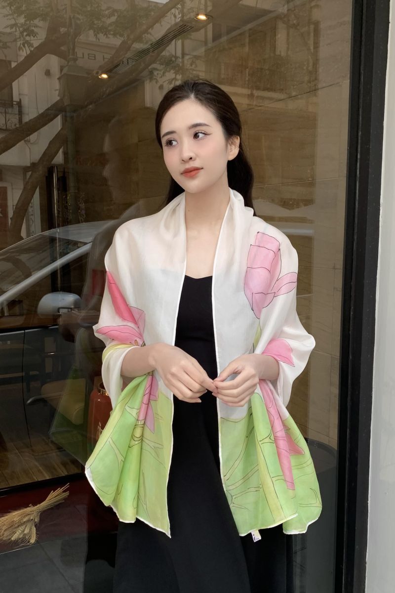 Khăn lụa tơ tằm vẽ tay hoa sen hồng nền xanh được đóng gói trong túi và hộp quà sang trọng, kèm bưu thiếp xinh xắn, sẵn sàng để trở thành món quà cao cấp mang đậm bản sắc văn hóa Việt Nam. Đây là lựa chọn lý tưởng cho doanh nghiệp khi tặng đối tác nước ngoài, hay cho những người đi công tác, du học, du lịch mang theo quà lưu niệm Việt tinh tế.
