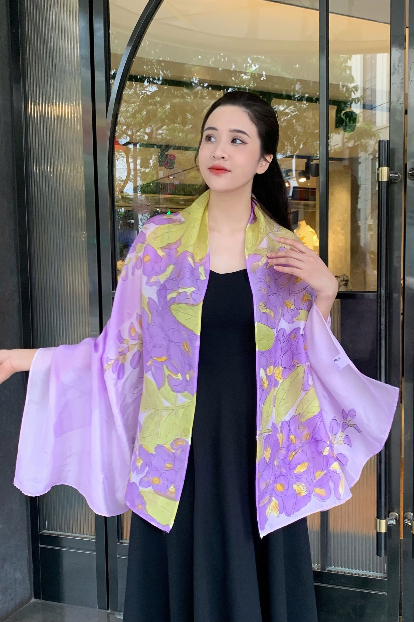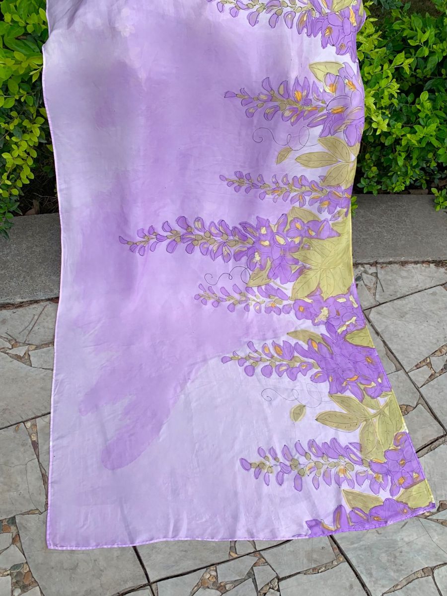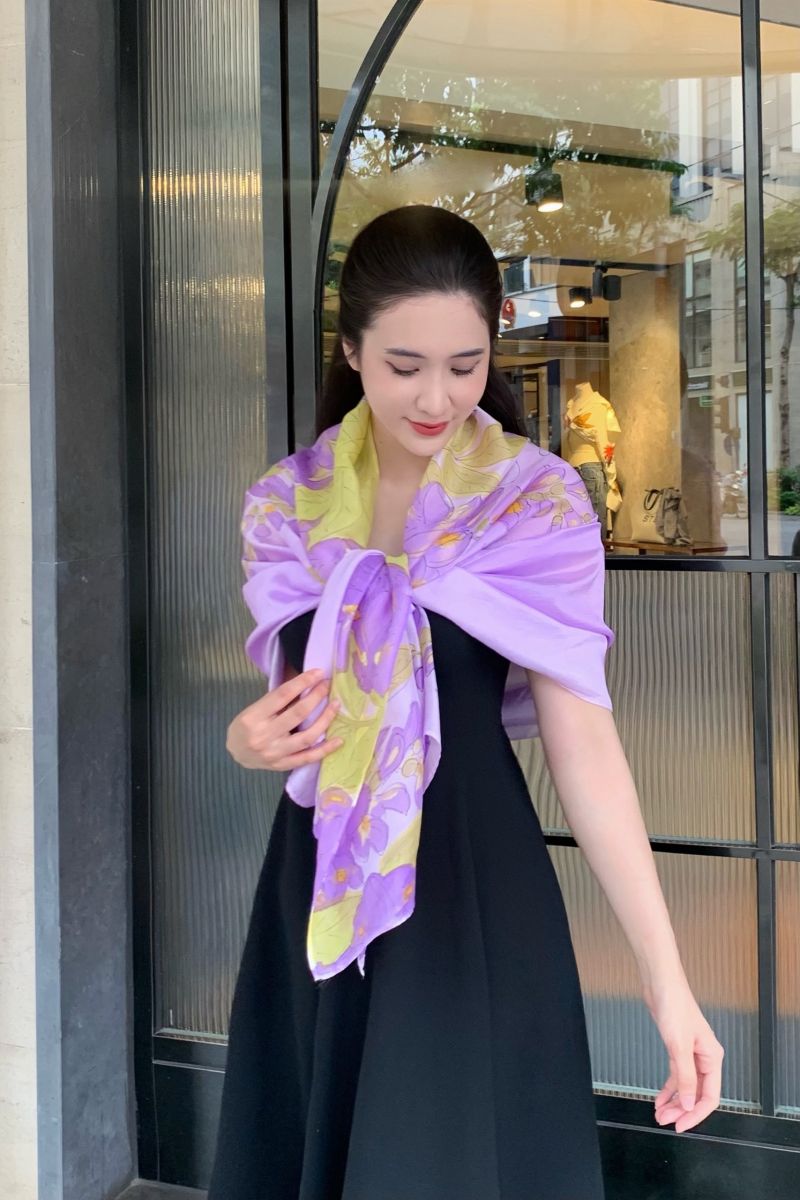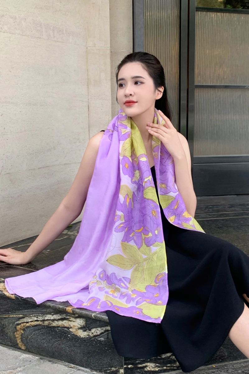 Được chế tác từ 100% lụa tơ tằm tự nhiên mềm mại, óng ả, chiếc khăn lụa vẽ tay hoa tử đằng tím của Kimcatsilk mang trong mình nét đẹp vừa tinh tế vừa giàu ý nghĩa. Mỗi đường cọ của nghệ nhân là sự kết hợp giữa kỹ thuật thủ công truyền thống và sự sáng tạo hiện đại, tạo nên một tác phẩm độc bản, không trùng lặp.