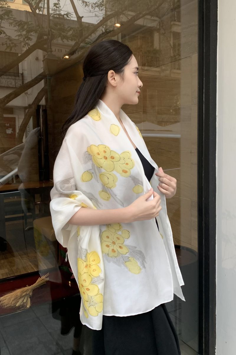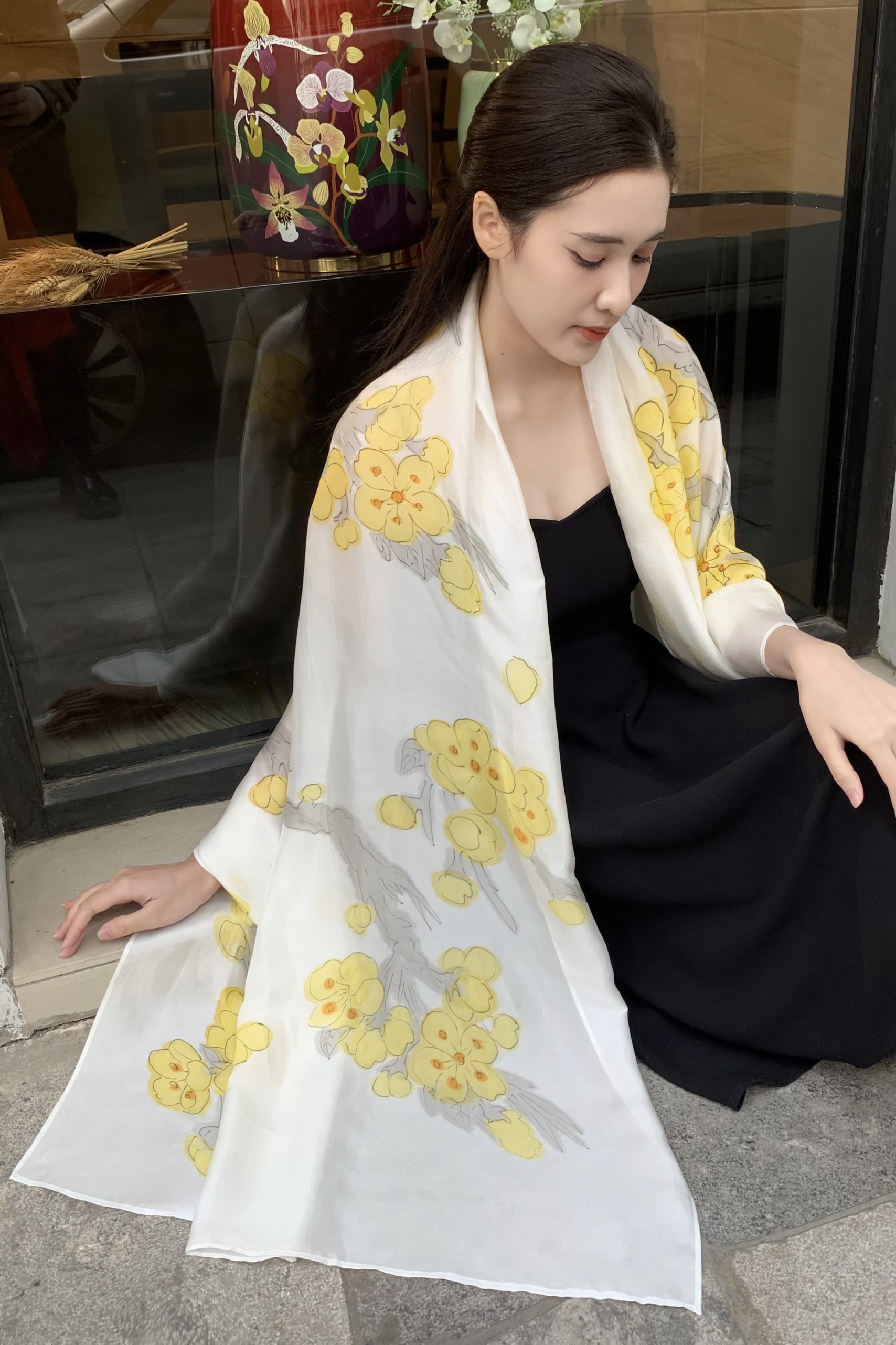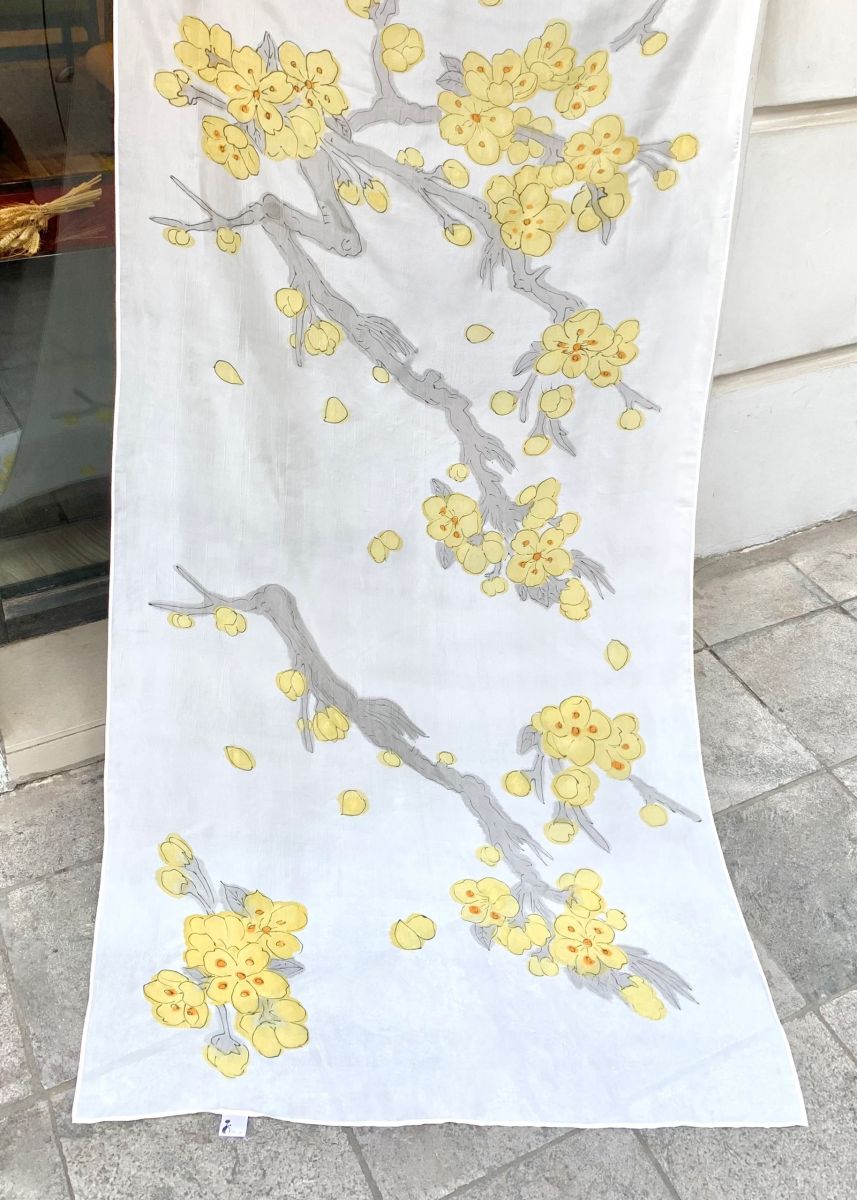 Khăn lụa tơ tằm vẽ tay cành mai vàng là sự kết hợp hoàn hảo giữa chất liệu lụa tơ tằm thượng hạng Việt Nam và nghệ thuật thủ công tinh tế. Trên nền lụa mềm mại, những cánh mai vàng – biểu tượng của sự may mắn, thịnh vượng và khởi đầu mới – được vẽ tay tỉ mỉ bởi nghệ nhân Kimcatsilk.