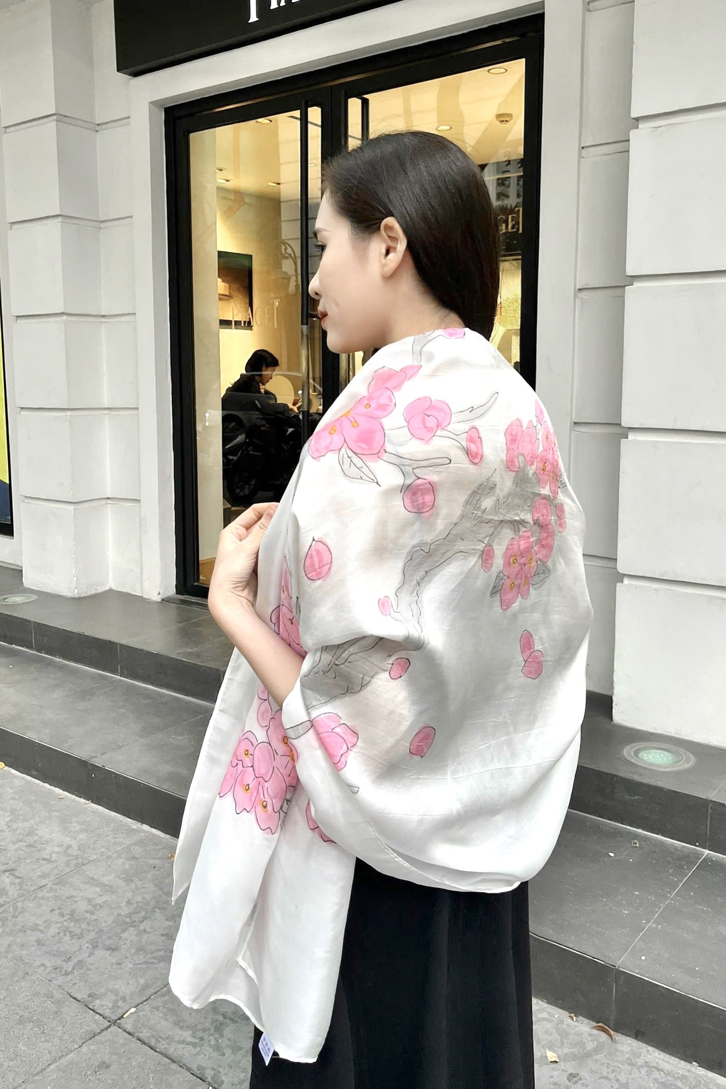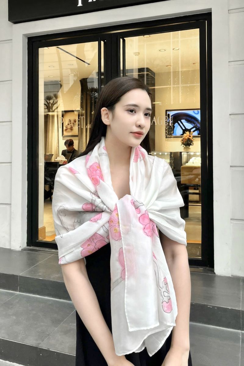 Sắc trắng, hồng và ghi thanh nhã giúp chiếc khăn lụa tơ tằm vẽ tay hoa đào trở thành phụ kiện lý tưởng để diện trong nhiều dịp: dự tiệc, đi làm, gặp gỡ đối tác hay dạo phố.