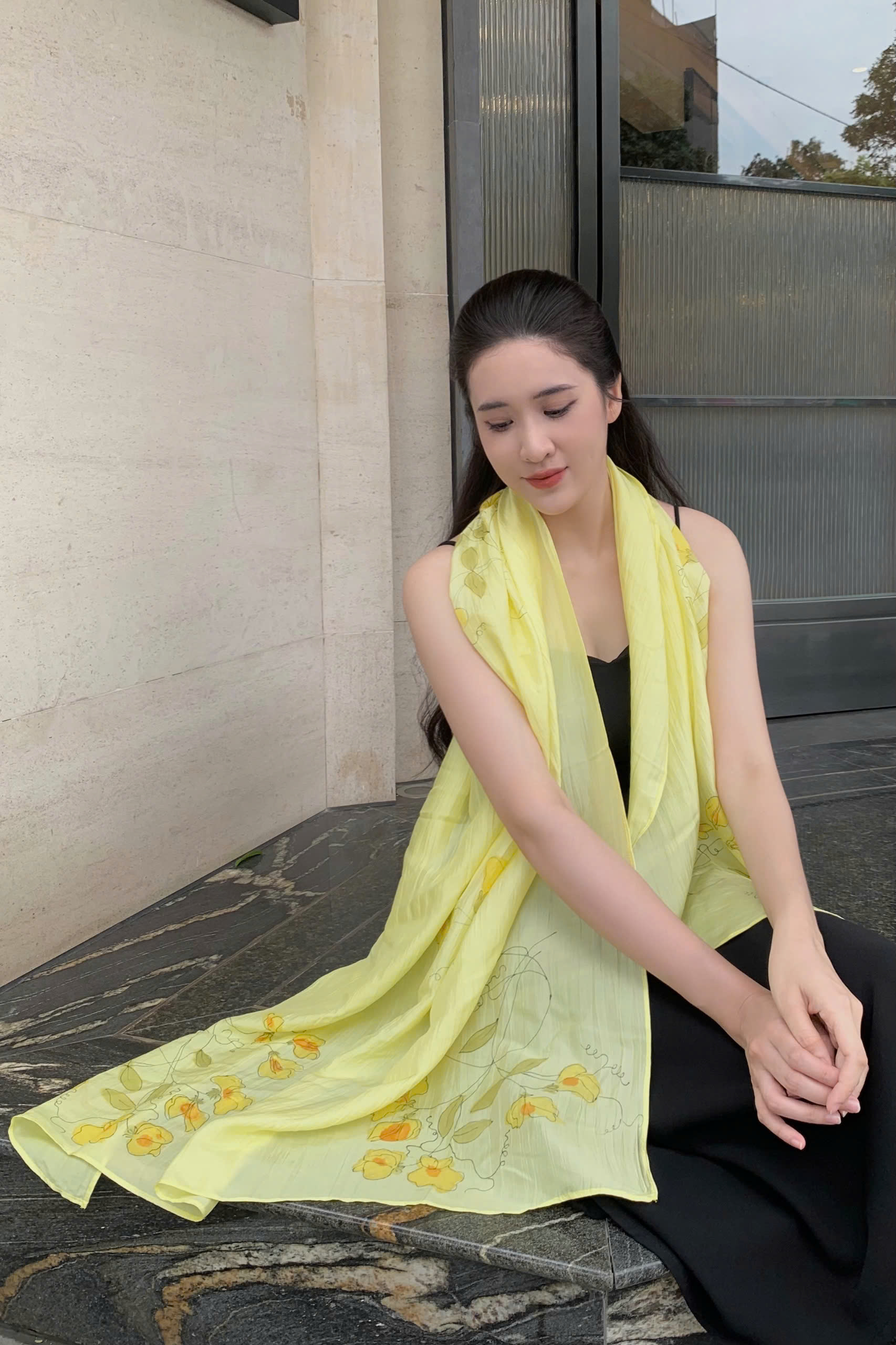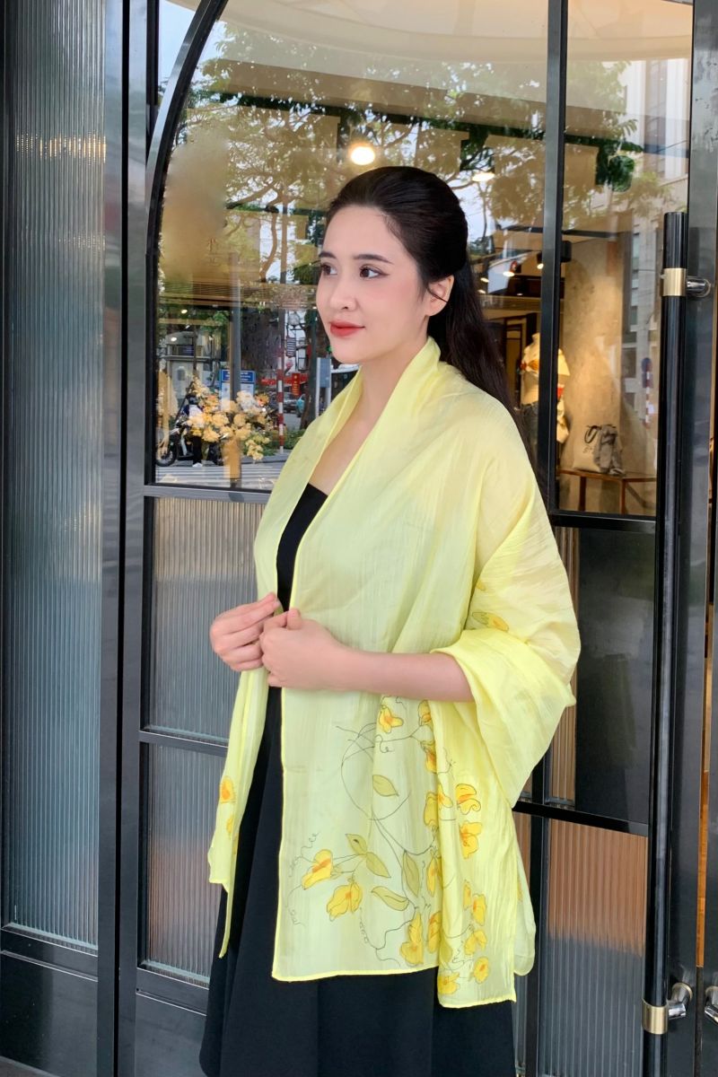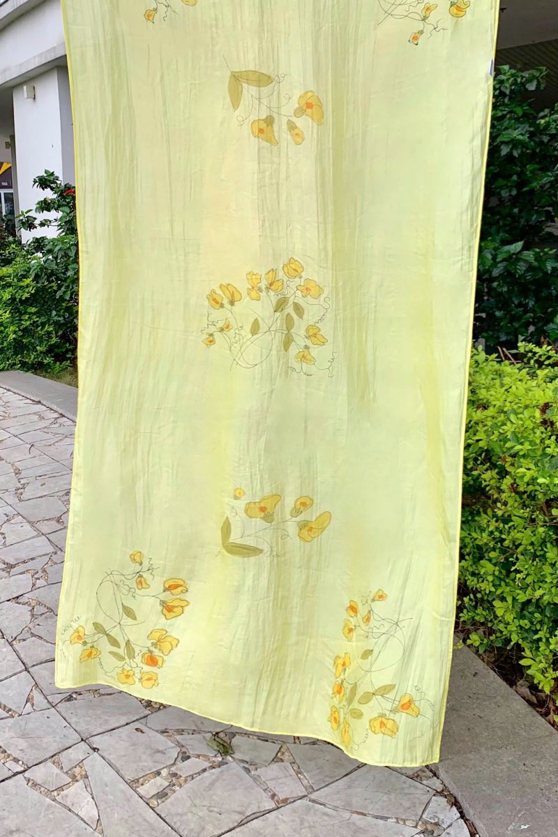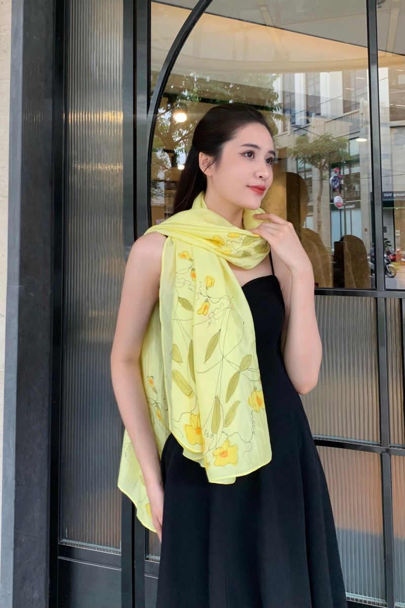 Khăn lụa tơ tằm vẽ tay hoa leo vànglà sự kết hợp hài hòa giữa chất liệu lụa truyền thống và nghệ thuật thủ công tinh xảo. Mỗi chiếc khăn được làm từ lụa tơ tằm Việt Nam 100%, mềm mại, nhẹ nhàng, tạo cảm giác thoáng mát và sang trọng khi khoác lên vai.