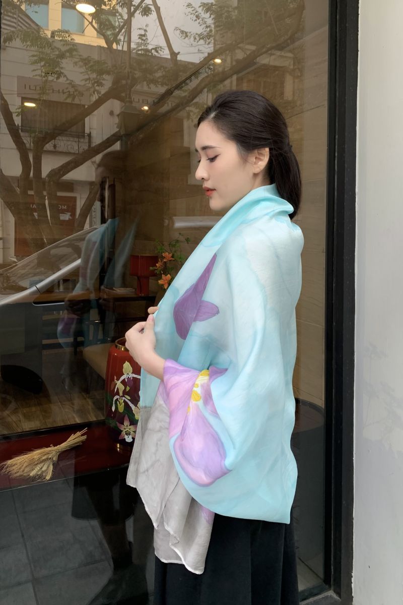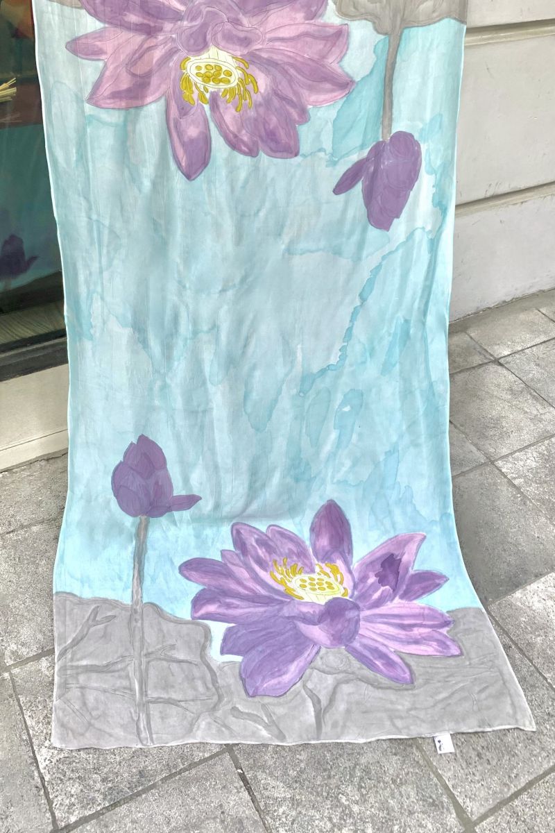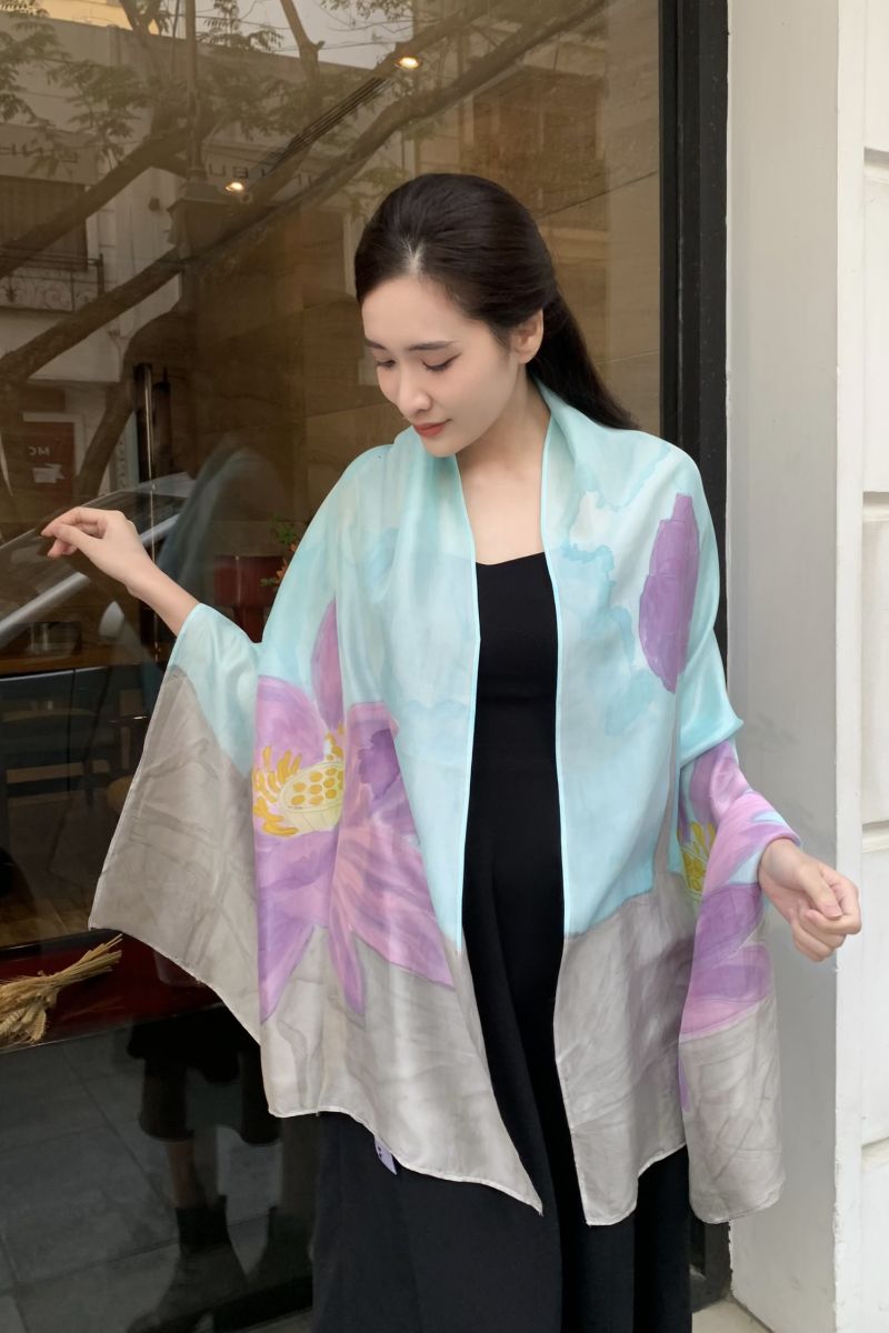 Được làm từ lụa tơ tằm 100% tự nhiên, chiếc khăn vẽ tay hoa sen tím trên nền xanh mang lại cảm giác mềm mại, nhẹ nhàng nhưng đầy cuốn hút. Mỗi chi tiết được nghệ nhân Kimcatsilk vẽ thủ công tỉ mỉ, tái hiện vẻ đẹp thuần khiết của hoa sen – loài hoa gắn liền với văn hóa và tinh thần người Việt.