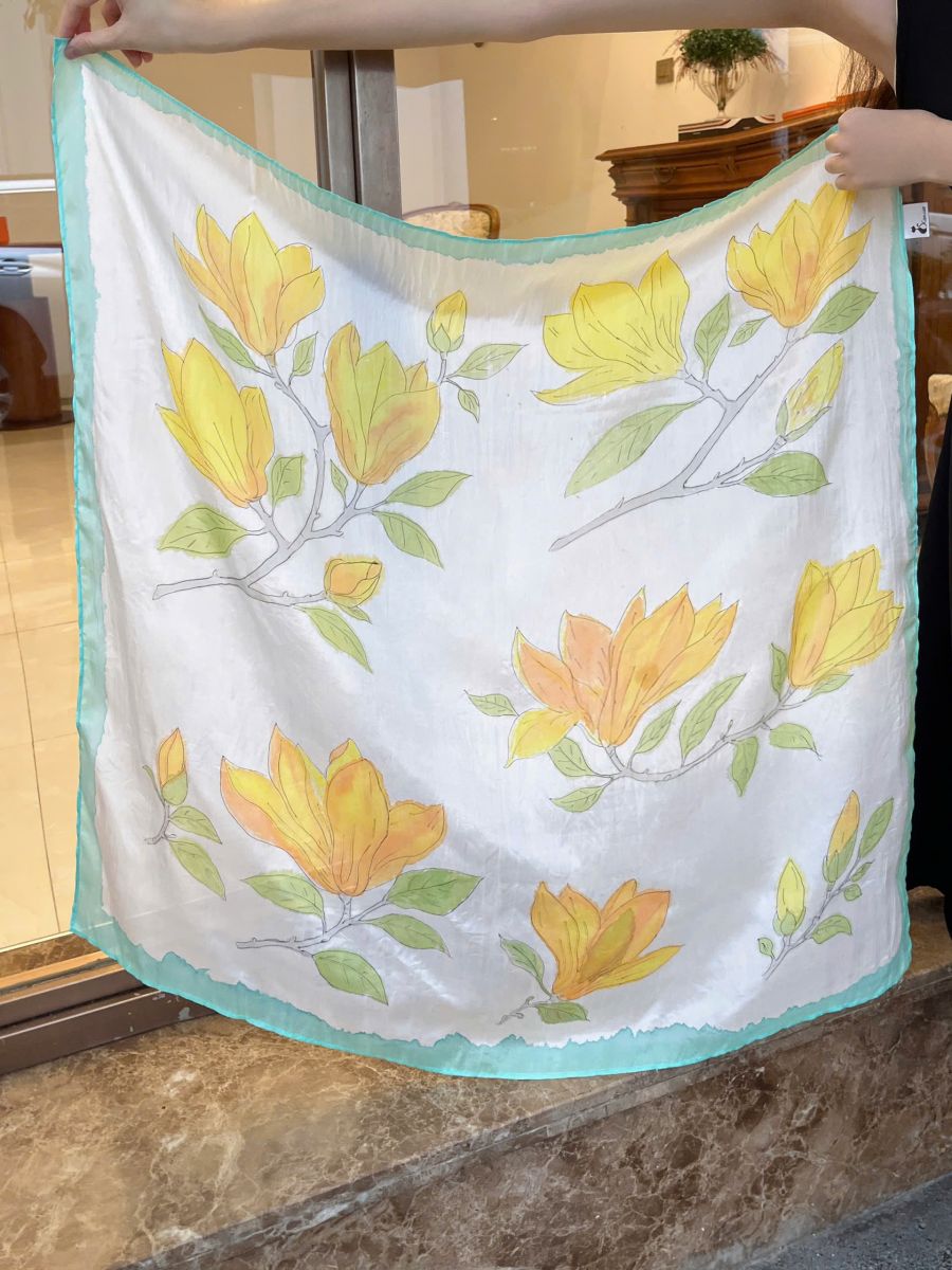Giới thiệu về khăn lụa vuông vẽ tay hoa mộc lan vàng