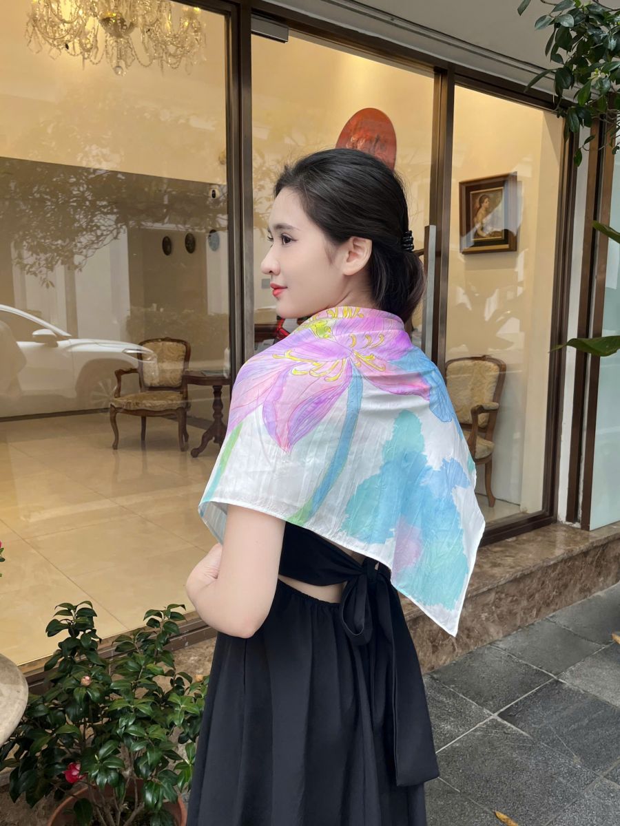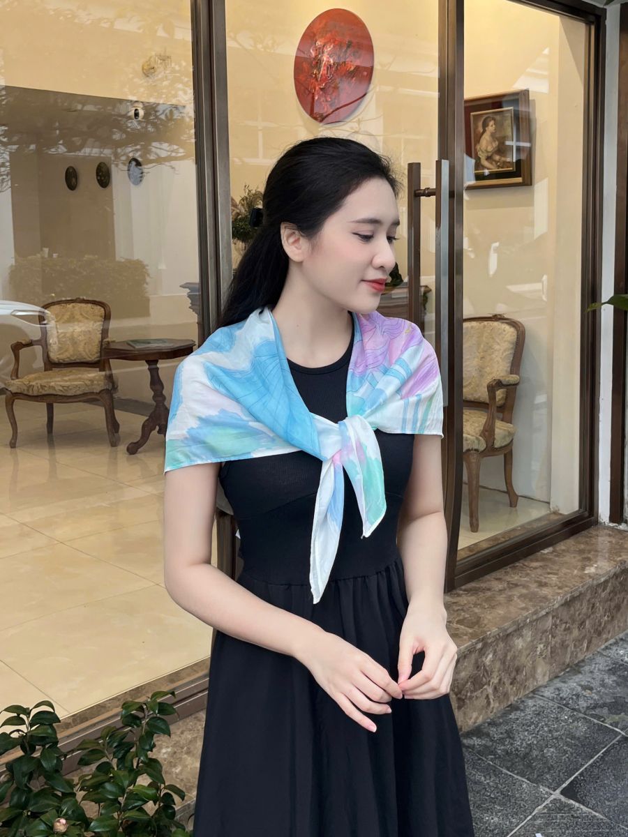 Chiếc khăn mang vẻ đẹp nhẹ nhàng và nghệ thuật, phù hợp với nhiều phong cách trang phục.