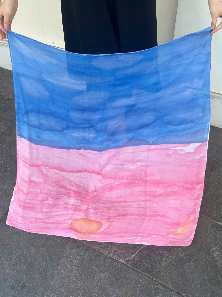 · Kỹ thuật: Kết hợp nhiều phương pháp thủ công: Ice Dye (tan chảy băng đá), Shibory (nhuộm buộc), và vẽ thủ công từng vệt màu trên khung vải.