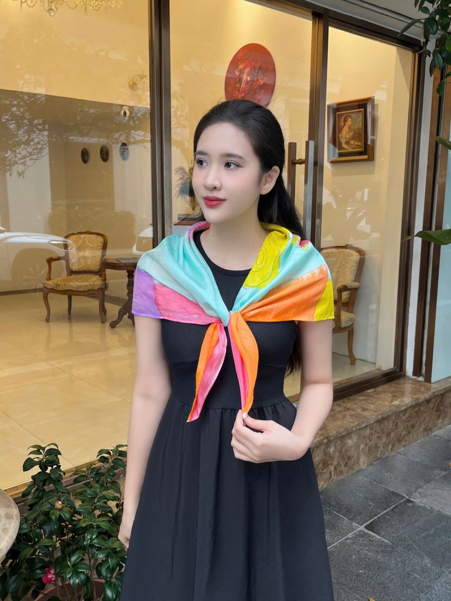 Họa tiết được vẽ tay hoàn toàn bằng màu chuyên dụng cho lụa, đảm bảo độ bền màu và không làm cứng vải. Mỗi chiếc khăn là một sản phẩm độc bản, mang dấu ấn riêng của nghệ nhân.