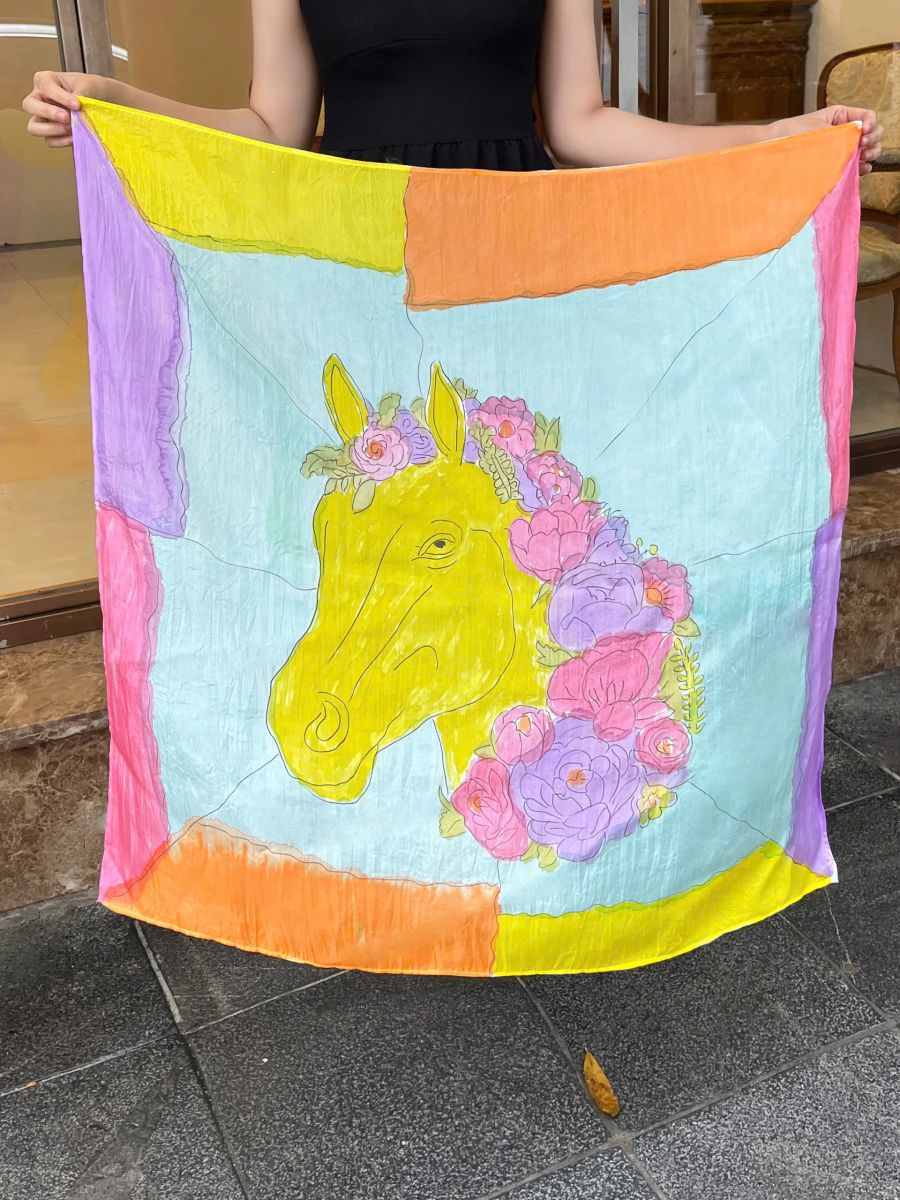 Khăn lụa tơ tằm vuông vẽ tay hình ngựa là sản phẩm kết hợp giữa chất liệu lụa truyền thống và nghệ thuật thủ công. Hình ảnh ngựa được thể hiện bằng nét vẽ tinh tế trên nền lụa mềm mại, tạo nên vẻ đẹp mạnh mẽ nhưng vẫn thanh lịch.